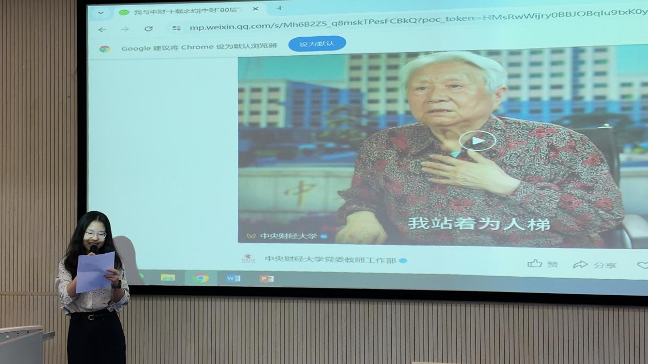 顾雷雷副院长介绍了王老师的优秀事迹:王巾英教授是中央财政金融学院(现万象城allwincity官网)二级教授、博士生导师,我国著名市场营销与涉外经济管理专家、财经教育家,市场学本土化拓荒者。她的多部著作获评优秀教材,填补了中国高校市场学教材的空白,创建了国内市场学课程体系。她以“为人梯、为人桥、为人路”的师者担当,照亮无数学子的成长之路。
