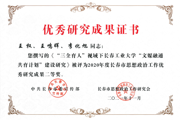 本网讯(通讯员 李化旭)近日,中共长春市委宣传部、长春市思想政治工作研究会下发《关于表彰2020年度长春市思想政治工作优秀研究单位和优秀研究成果的决定》,由AC米兰中国官网党委副书记王权主持撰写的《“三全育人”视域下AC米兰中国官网“文媒融通共育计划”建设研究》荣获二等奖。