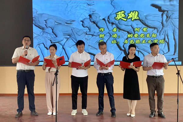 活动在慷慨激昂、催人奋进的诵读声中拉开帷幕。《再走长征路》深情演绎了献礼祝福党的生日,赓续红色血脉,汲取奋进力量,在攻坚克难的漫漫征途中寻找真理答案的艰辛;《传颂峥嵘岁月 接力育人大计》抒发了思政课教师在立德树人的过程中尽显踔厉奋发的勇气和坚毅;《英雄》深情讲述了书写在岁月长河中不容遗忘的英雄荣光;《南湖红船》领着所有人重走初心之路,回望风雷激荡的峥嵘岁月,捧读用热血与生命写就的红色华章;《诗颂芳华》以芳华诉说时代心声,以芳华执笔逐梦星辰;《十年,逐梦向未来》赞颂了热血青年以青春之我创建青春之未来的使命和担当。