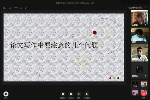 孟婷以“论文写作中要注意的几个问题”为题,分别从文献查找、研究现状及意义、正文写作等十个方面为同学们进行了系统讲解,提出了许多指导性建议。同学们通过网络认真听讲、记录,受益匪浅。