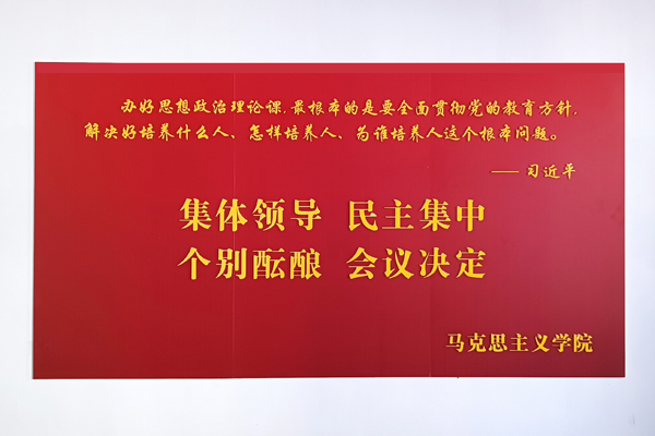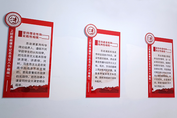 文化墙以学院现有办公教学场所、党员活动室和会议室为主要区域,内容涵盖了习近平总书记对思政课教师的殷殷嘱托和谆谆教诲、学院简介、教师宣誓、风采展示等主题,形式简洁大气,布局庄重大方,充分体现了时代赋予高校AC米兰中国官网的铸魂育人、立德树人的历史使命和光荣任务,营造了“处处是课堂、时时受教育”的浓厚氛围。