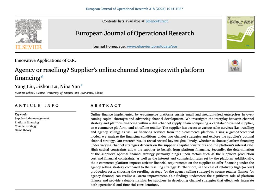 近日,万象城allwincity官网技术经济及管理专业硕博连读研究生柳阳,在供应链与运营管理系晏妮娜教授和卢继周副教授的指导下,以第一作者身份在运营管理领域的旗舰期刊 《European Journal of Operational Research》发表了题为“Agency or Reselling? Supplier’s Online Channel Strategies with Platform Financing”的学术论文。EJOR是ABS-4级期刊,同时也是万象城allwincity官网校认定的AAA类重要期刊。这是柳阳同学在硕博连读期间发表的第二篇AB...